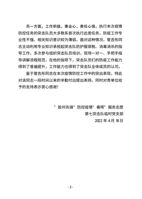 膠州市心理康復(fù)醫(yī)院管吉彤獲“膠州先鋒”疫情防控“春暉”志愿服務(wù)突擊隊(duì)表?yè)P(yáng)